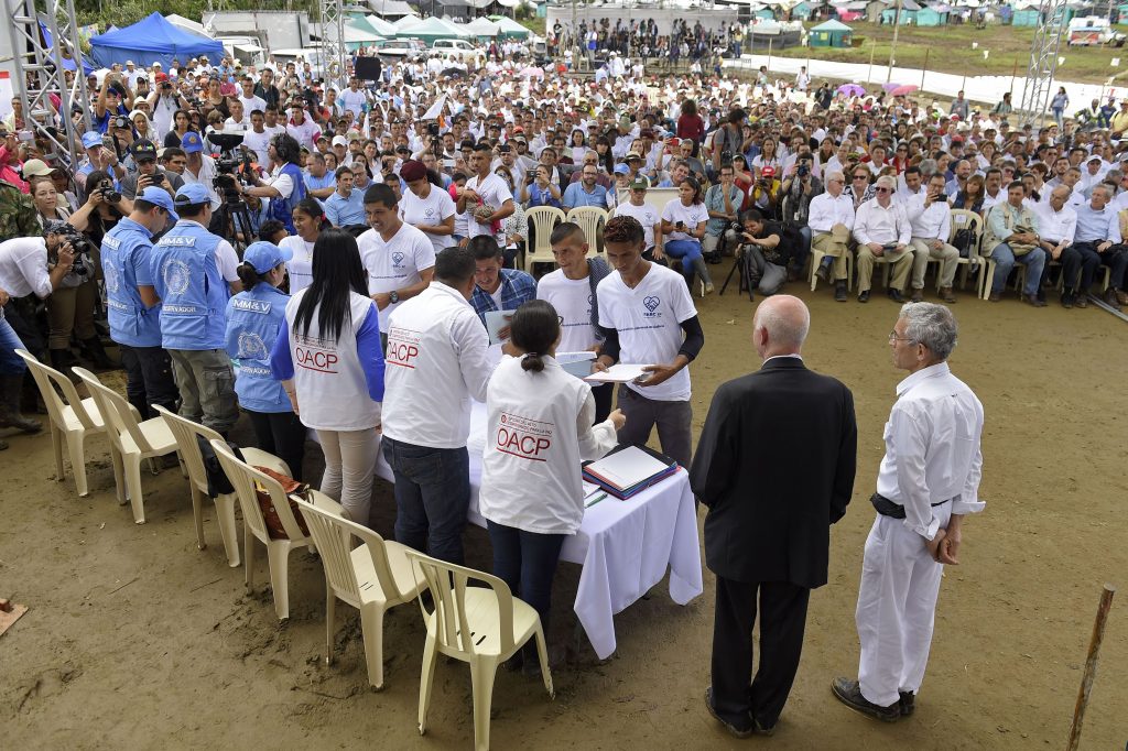 Imagen del acto de Dejación de las Armas por parte de los integrantes de las FARC-EP ante el Mecanismo de Verificación. Allí, de manera individual fueron entregando su armamento, recibieron la certificación de esta acción por parte de ONU y firmaron el Acta de Compromiso en la que se comprometen a dejar de usar las armas, no volver a usarlas y cumplir con lo acordado para ingresar a la vida civil. Con estos dos documentos y tras verificar los listados entregados por las FARC-EP al Gobierno, recibieron la Acreditación por parte de la Oficina del Alto Comisionado para la Paz que les permitirá acceder y participar de todas las medidas de reincorporación previstas en el Acuerdo Final. Foto por Efraín Herrera.