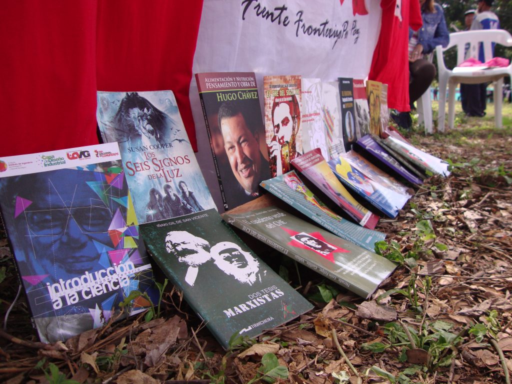 Exposición de material bibliográfico que estuvo disponibles en la Biblioteca de las FARC-EP en la Zona Veredal Transitoria de Normalización – ZVTN Amaury Rodríguez, de Pondores, municipio de Fonseca, en La Guajira. Fotografía por Alain Cuadro