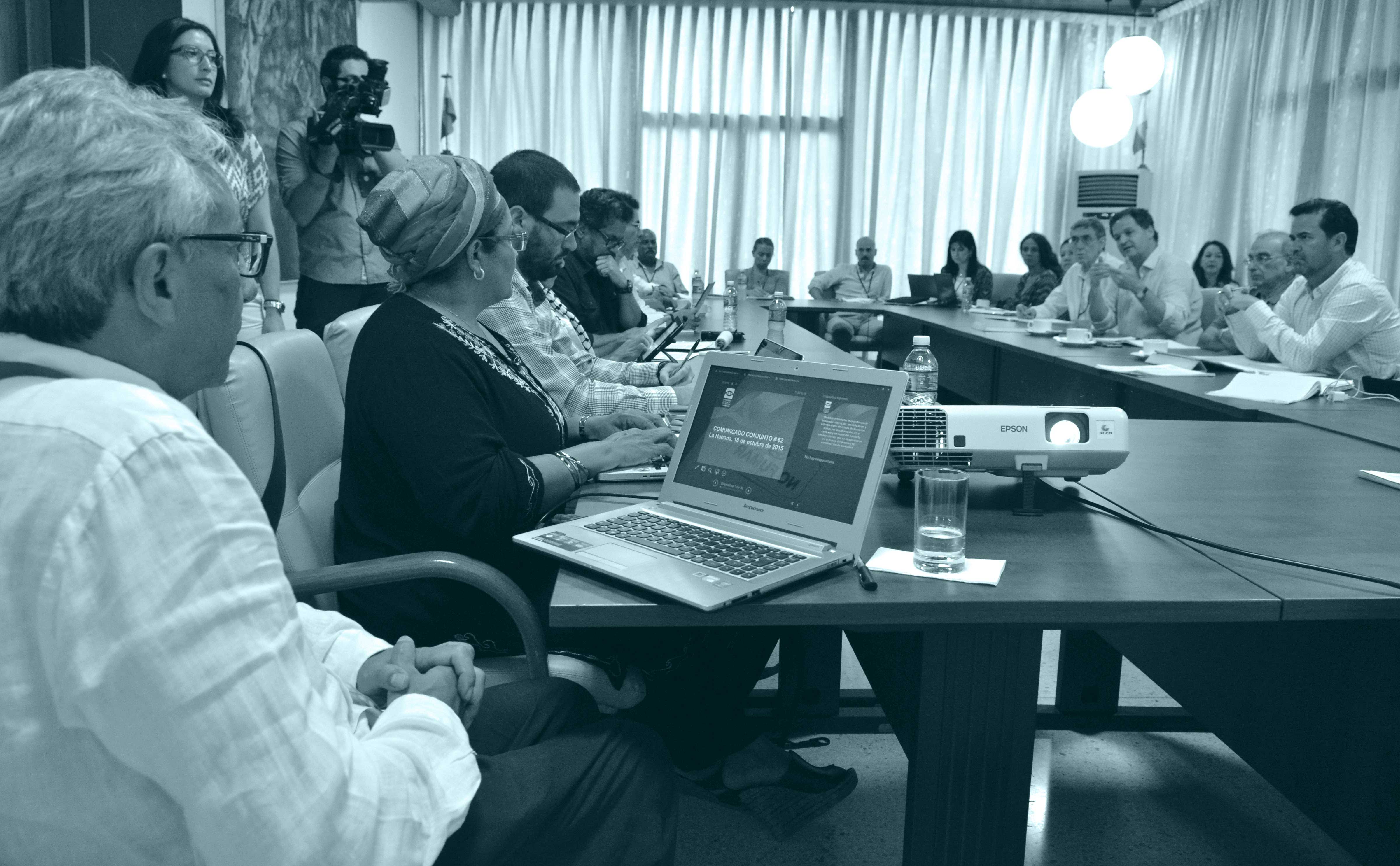 El director de Medicina Legal, Carlos Eduardo Valdés Moreno, se reúne con los miembros de las delegaciones del Gobierno nacional y las FARC-EP en la Mesa de Conversaciones, acompañados por los representantes de los países garantes, Cuba y Noruega.