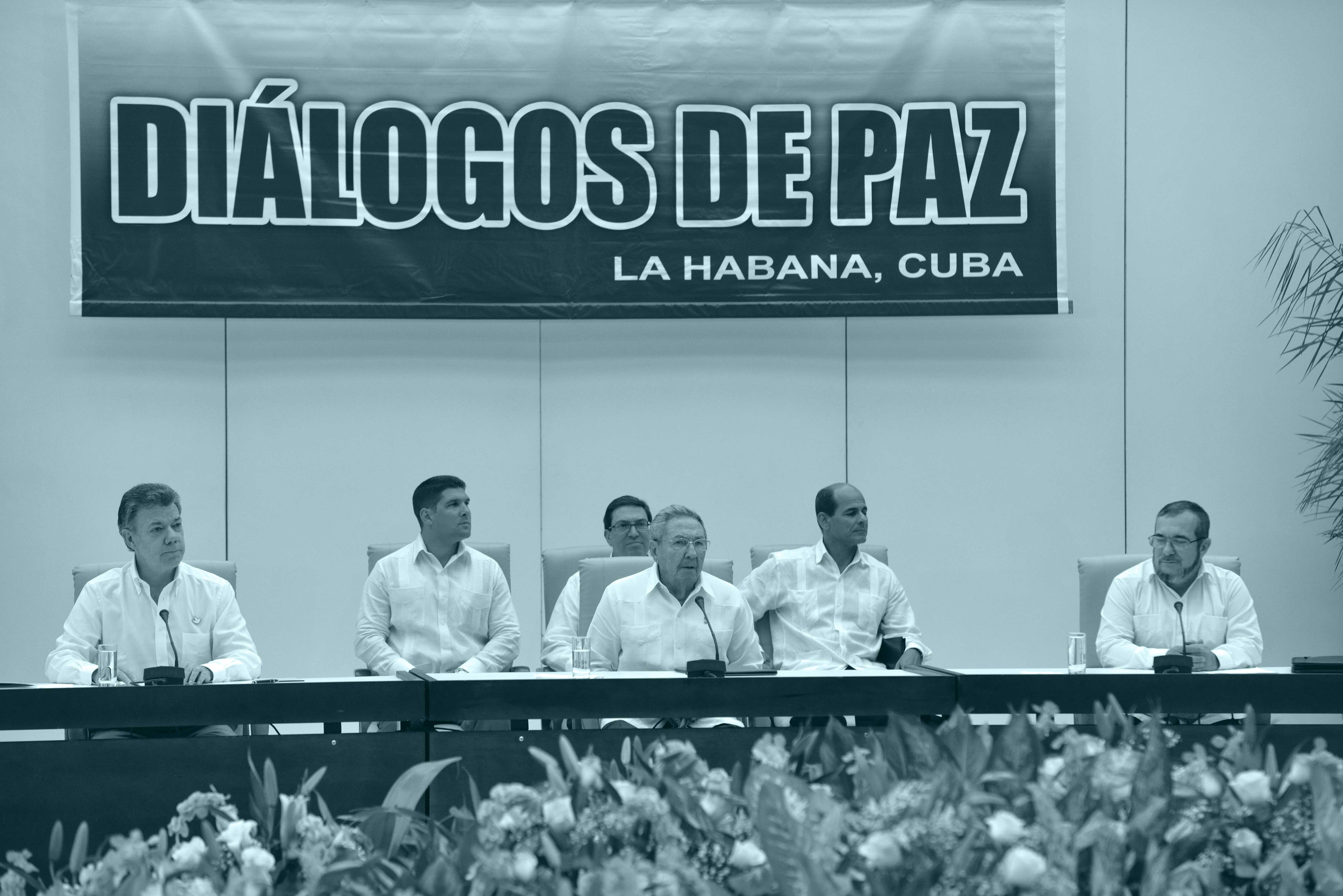 Ceremonia de anuncio del acuerdo de justicia. En la mesa principal se encuentran el presidente Juan Manuel Santos Calderón, el presidente de Cuba, Raúl Castro Ruz, y el comandante de las FARC-EP, Rodrigo Londoño Echeverri (Timoleón Jiménez, Timochenko).