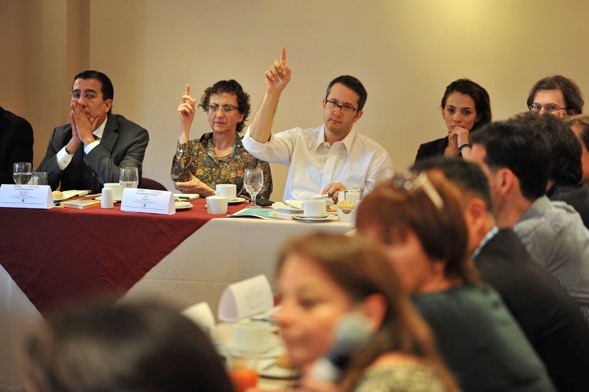 Imagen de la reunión de Sergio Jaramillo Caro, alto comisionado para la paz y Humberto de la Calle Lombana, jefe del equipo negociador del Gobierno con las FARC-EP con los corresponsales de los medios internacionales, con base en Colombia. Este fue un espacio distinto al de una rueda de prensa, en el que dialogaron sobre el Proceso de Paz, su estado al inicio del nuevo año y ofreció un contexto amplio para hacer una buena cobertura del proceso. Bogotá, 12/01/2016.