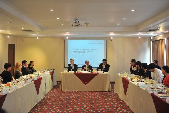 Imagen en la que treinta corresponsales de medios internacionales, con base en Colombia, se reunieron con el alto comisionado para la paz, Sergio Jaramillo Caro, y con el jefe del equipo negociador del Gobierno Humberto de la Calle Lombana. Allí hablaron de las negociaciones de paz entre el gobierno nacional y las FARC-EP y los retos informativos que enfrentarían en el 2016. Bogotá, 12/01/2016