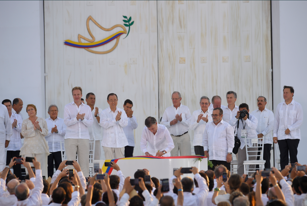 El presidente Juan Manuel Santos Calderón firma el histórico Acuerdo de Paz con las FARC-EP durante la ceremonia en Cartagena.