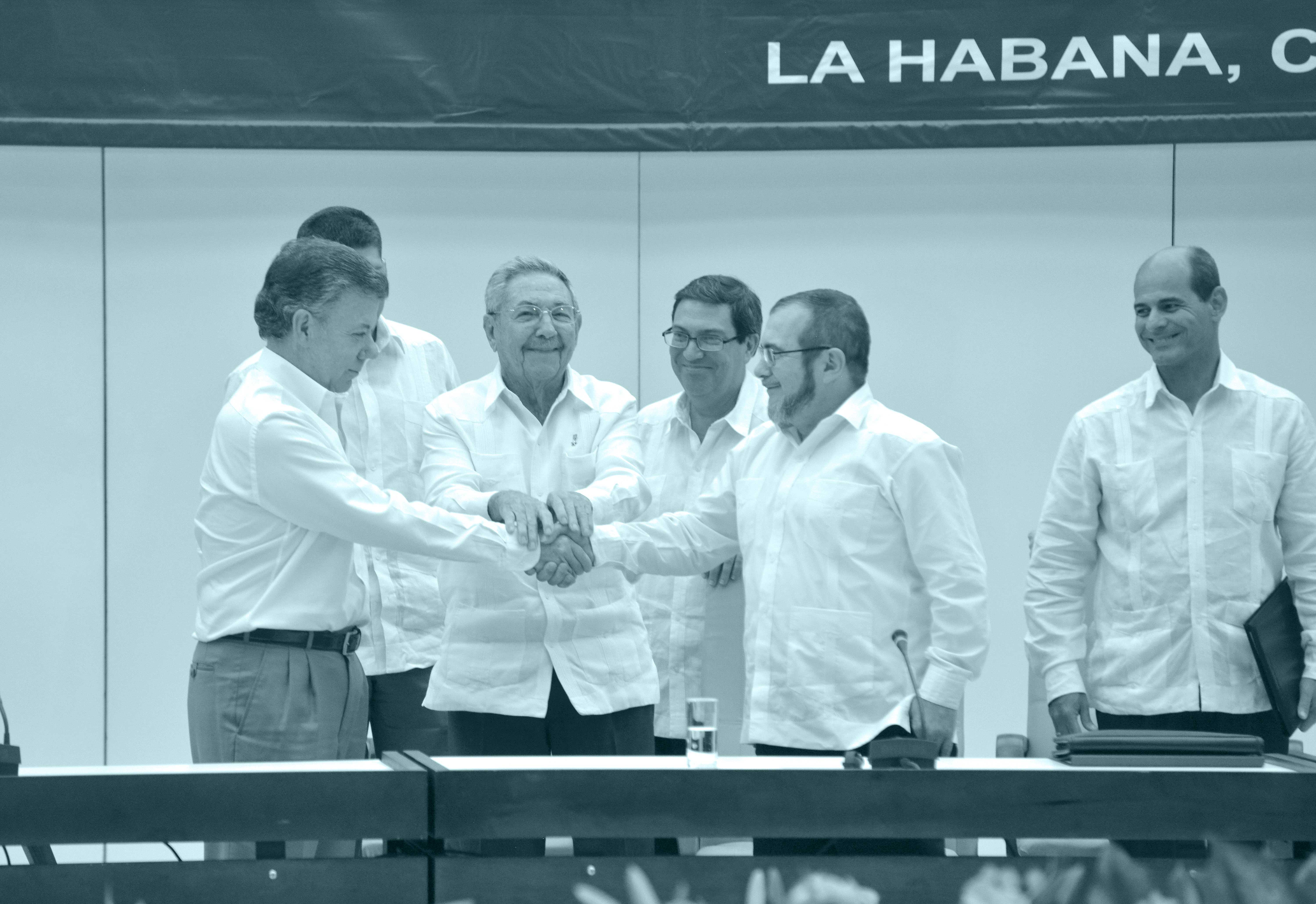 El presidente Juan Manuel Santos Calderón, el presidente de Cuba, Raúl Castro Ruz, y el comandante de las FARC-EP, Rodrigo Londoño Echeverri (Timoleón Jiménez, Timochenko), durante el anuncio del acuerdo de la Jurisdicción Especial para la paz.
