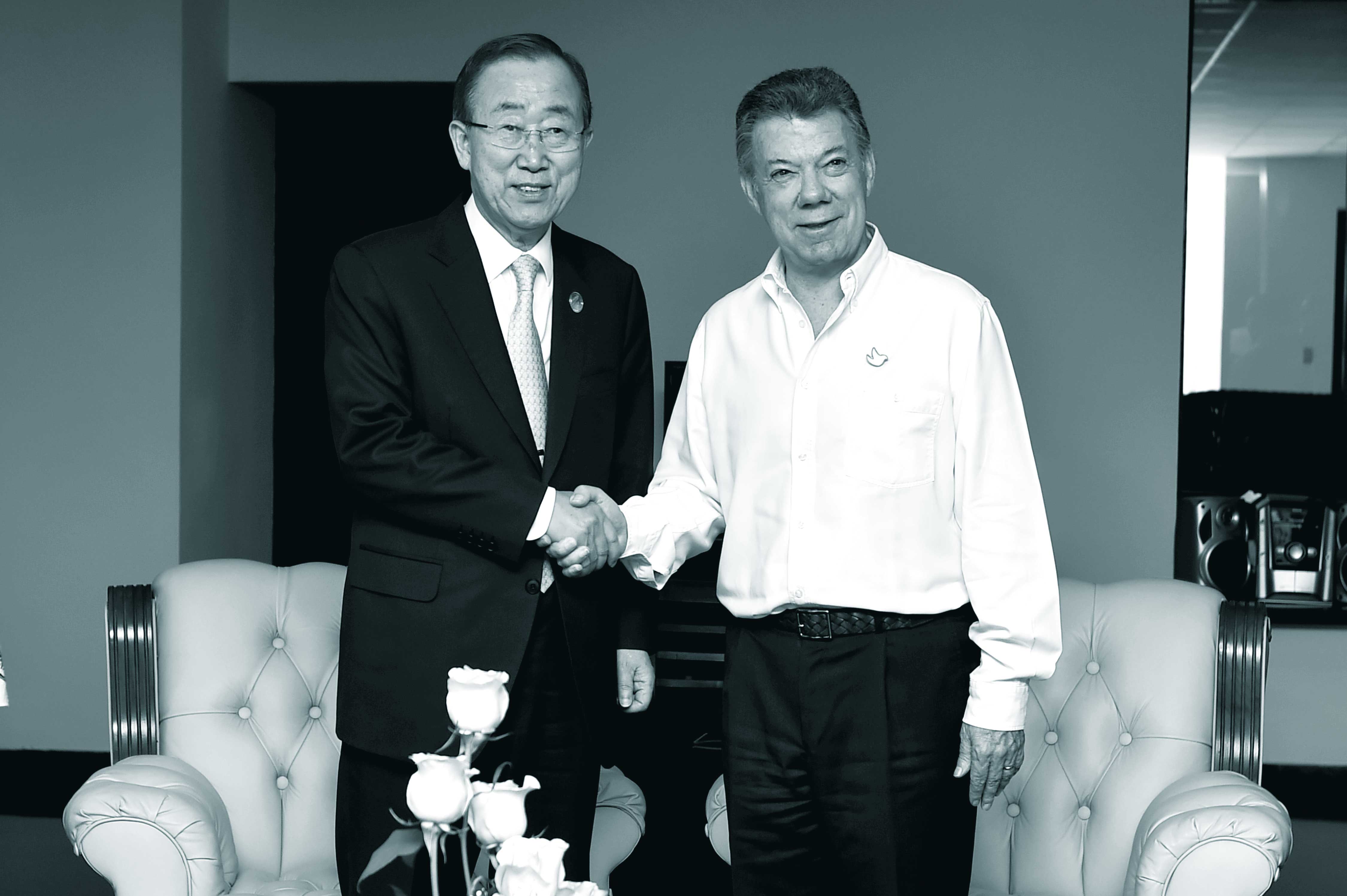 Momentos antes del inicio del acto para la firma del acuerdo sobre cese al fuego bilateral y definitivo con las FARC-EP, el presidente Juan Manuel Santos Calderón se reúne con el secretario general de la Organización de las Naciones Unidas, Ban Ki-moon.