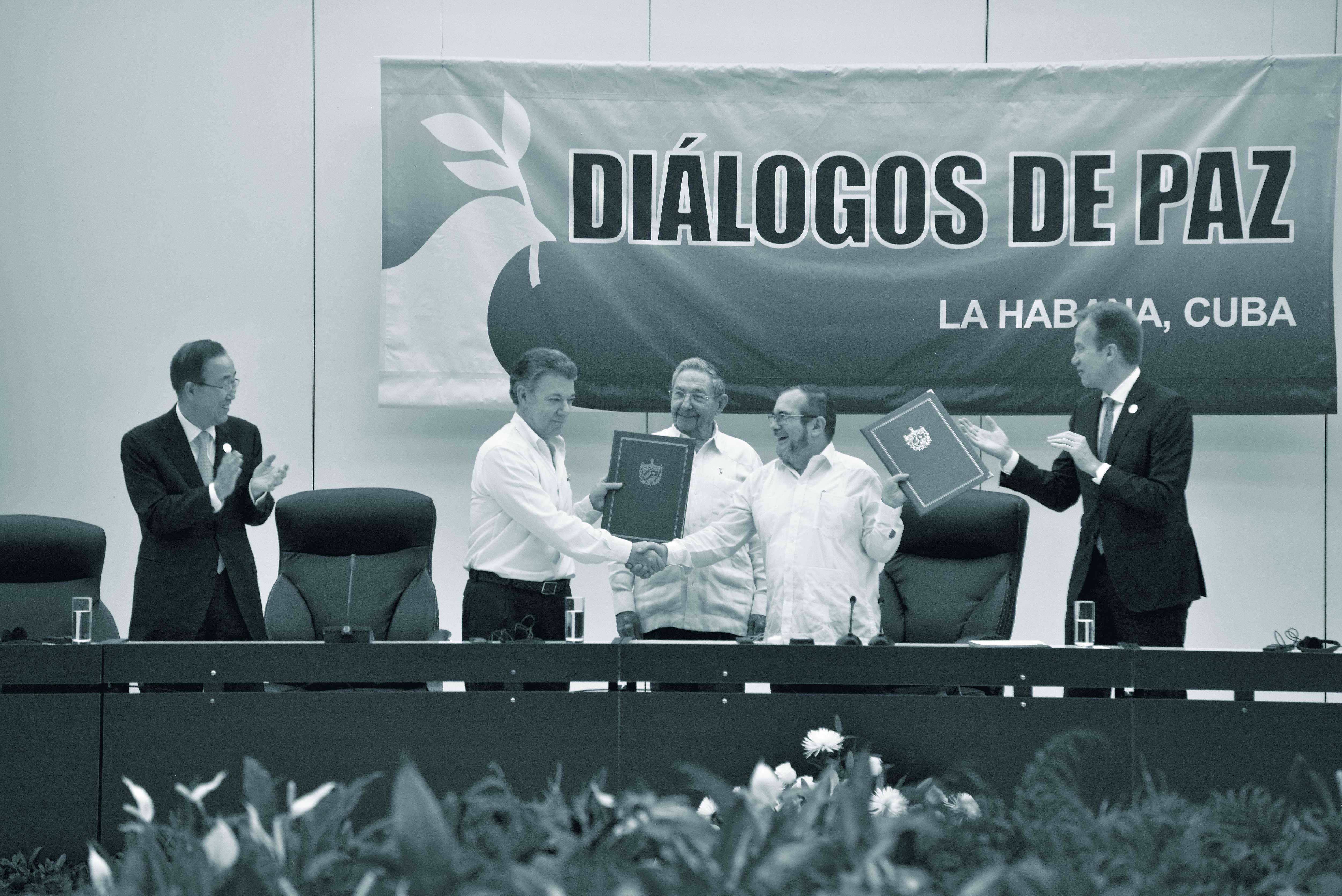 El presidente Juan Manuel Santos Calderón, el presidente de Cuba, Raúl Castro Ruz, y el comandante de las FARC-EP, Rodrigo Londoño Echeverri (Timoleón Jiménez, Timochenko), durante la firma del acuerdo sobre Cese al Fuego y de Hostilidades Bilateral y Definitivo, garantías seguridad y lucha contra organizaciones criminales.