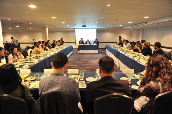 Imagen del encuentro de Sergio Jaramillo Caro, alto comisionado para la paz y Humberto de la Calle Lombana, jefe del equipo negociador del Gobierno con las FARC-EP con los periodistas de Palacio de Nariño y del Congreso de la República en Bogotá. 24/02/2016.