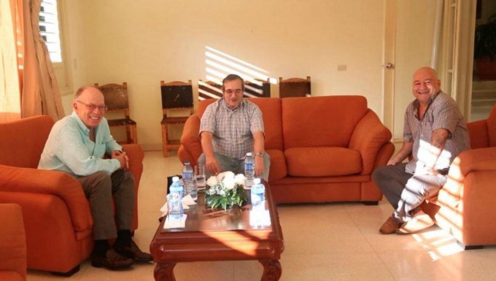Enrique Santos Calderón, Rodrigo Londoño Echeverri (Timoleón Jiménez) y Julián Gallo Cubillos (Carlos Antonio Lozada), en reunión. 28/04/2015. La Habana, Cuba. Foto de El Heraldo