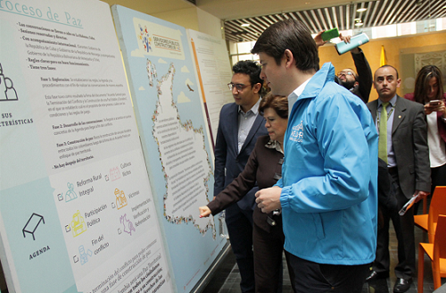 En la imagen, Liliana Caballero y Sebastián Guerra del Departamento Administrativo de la Función Pública (DAFP), presentan la exposición itinerante a los servidores públicos y al secretario de Gobierno de la Alcandía de Bogotá, Miguel Uribe Turbay. La exposición rotó por las distintas secretarías de la Alcaldía en el mes de abril, generando reflexiones sobre los retos de la administración pública en la construcción de la paz.