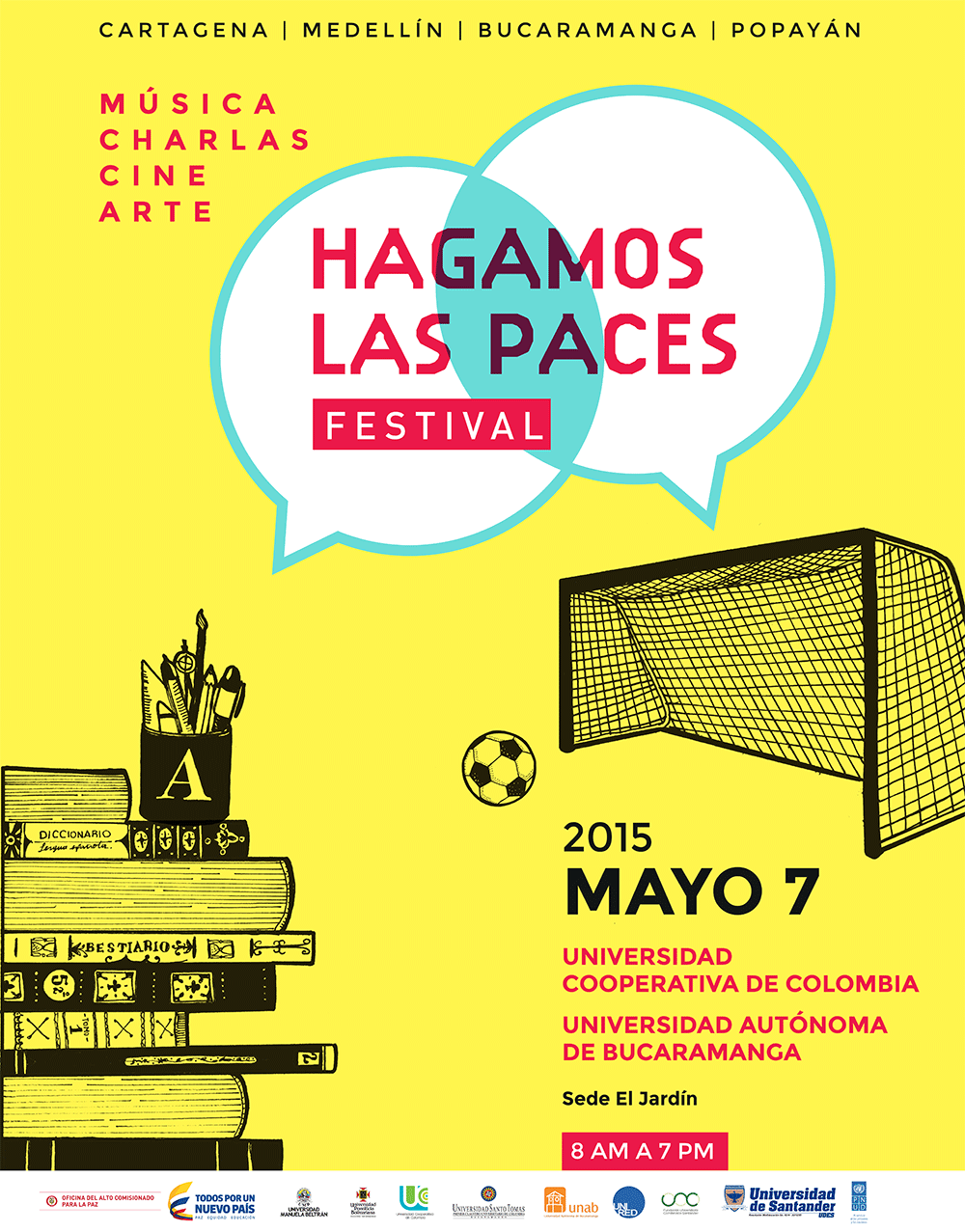 Poster de la campaña publicitaria del Festival hagamos las paces, evento promovido por la Oficina del Alto Comisionado para la Paz con el apoyo de las universidades y el Programa de las Naciones Unidas para el Desarrollo – PNUD. Este evento fue un aporte desde la academia al proceso de paz que se desarrollaba en La Habana, Cuba. Durante un día las universidades participantes vivieron experiencias de paz a través de actividades lúdicas y académicas. La música, el arte, documentales, música, charlas, proyecciones de películas, exposiciones fotográficas, presentación de obras de teatro y talleres, entre otras, fueron una forma de hacer pedagogía de paz y de acercar al sector educativo y a la sociedad en general al proceso de construcción de paz. En esta imagen, el poster del evento realizado el 7 de mayo de 2015 en la Universidad Cooperativa de Colombia y la Universidad Autónoma de Bucaramanga – Sede El Jardín, de 8:00 a.m. – 7:00 p.m., con el apoyo la Universidad Manuela Beltrán, la Universidad Pontificia Bolivariana – Seccional Bucaramanga, la Universidad Santo Tomás – Bucaramanga, la Universidad Autónoma de Bucaramanga – unab, UNIRED, la Fundación Universitaria Comfenalco Santander, la Universidad de Santander.