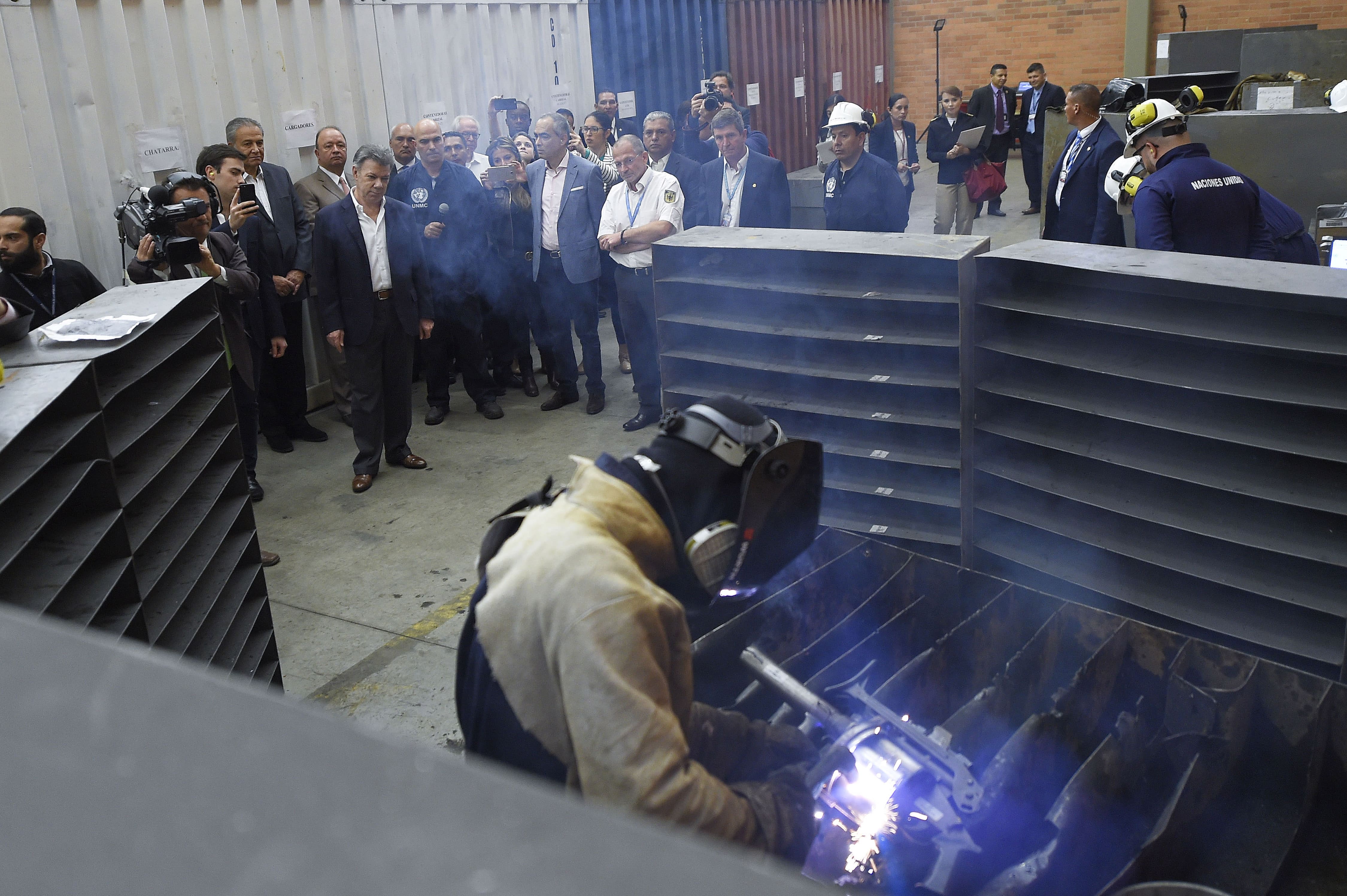 Los integrantes de la Misión de Verificación de la ONU en Colombia le mostraron al presidente Juan Manuel Santos Calderón y a los medios de comunicación el proceso de inhabilitación de las armas entregadas por los excombatientes de las FARC-EP. Foto por Efraín Herrera.