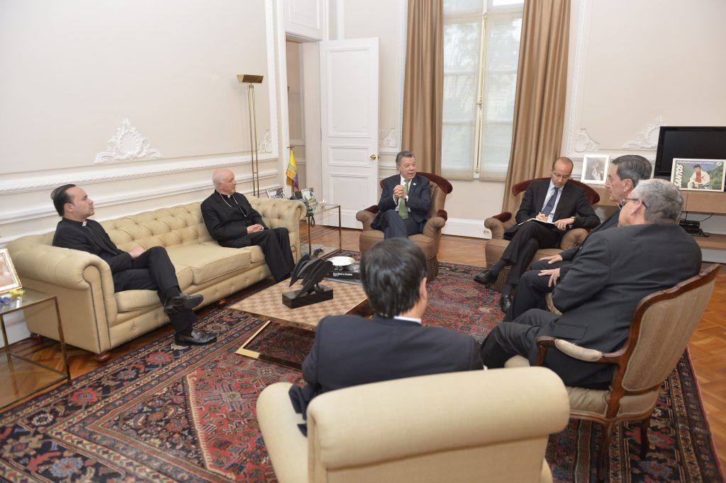 Para sacar adelante los acuerdos de La Habana tras el triunfo del “No” en el plebiscito por la Paz, el presidente Juan Manuel Santos Calderón convocó a un diálogo nacional por la paz en busca de consensos. En esta imagen, reunido con representantes de la Iglesia Católica, entre los que se encuentran monseñor Luis Augusto Castro Quiroga, presidente de la Conferencia Episcopal de Colombia, el cardenal Rubén Salazar Gómez, arzobispo de Bogotá, entre otros asistentes. Foto de Juan David Tena.