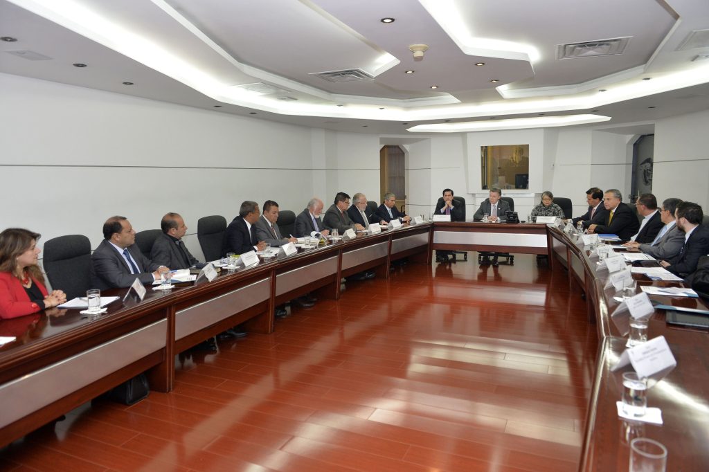 Imagen de la reunión que sostuvo el presidente Juan Manuel Santos Calderón en la Casa de Nariño con líderes de las iglesias cristianas dentro del proceso de diálogo que buscaba llevar a feliz término el Proceso de Paz, tras el triunfo del “No” en el plebiscito del 2 de octubre de 2016. Foto por Juan David Tena.