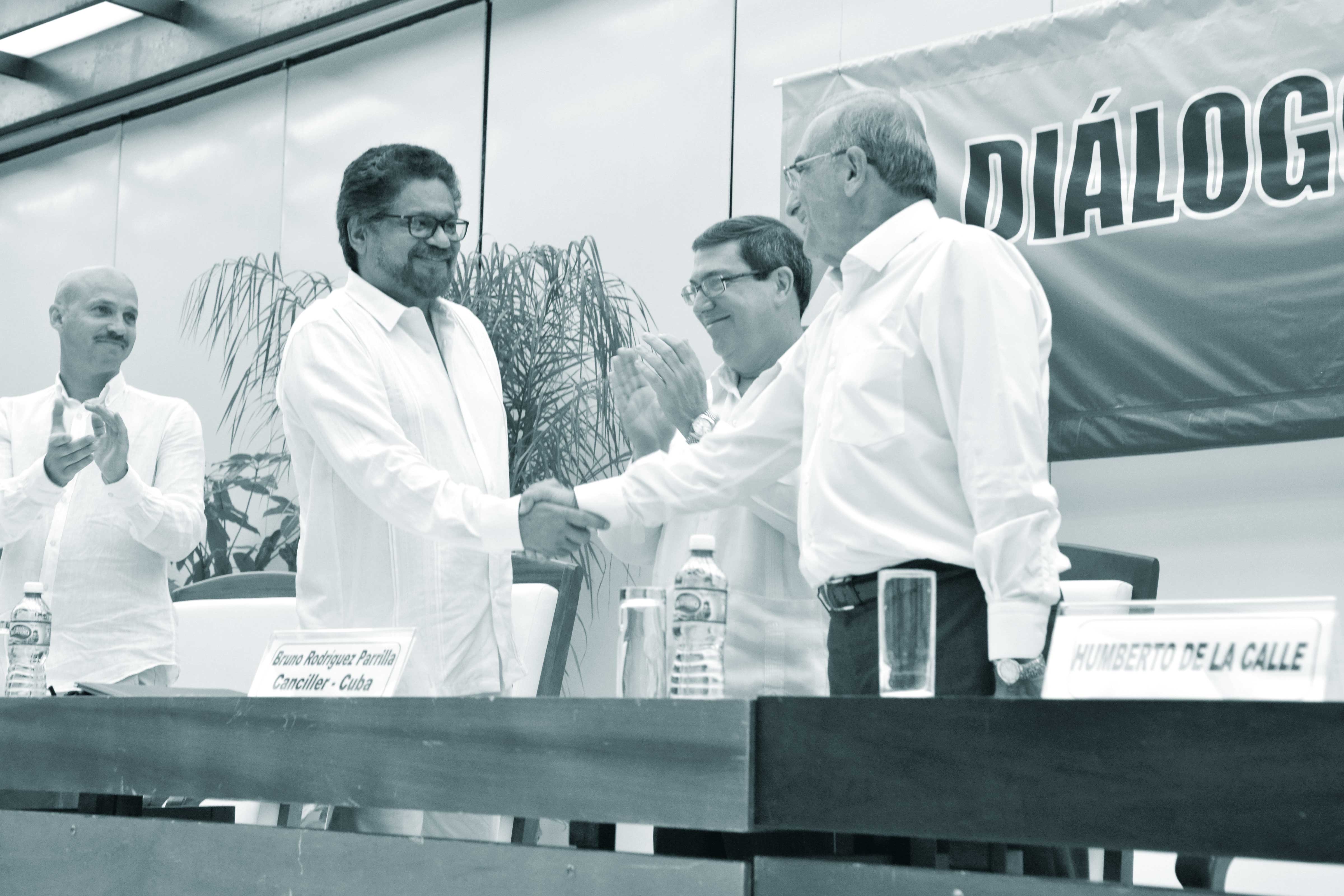 Humberto de la Calle Lombana, jefe de la Delegación del Gobierno nacional, y Luciano Marín Arango (Iván Márquez), jefe de la Delegación de Paz de las FARC-EP, se dan la mano durante el anuncio del acuerdo integral en La Habana.