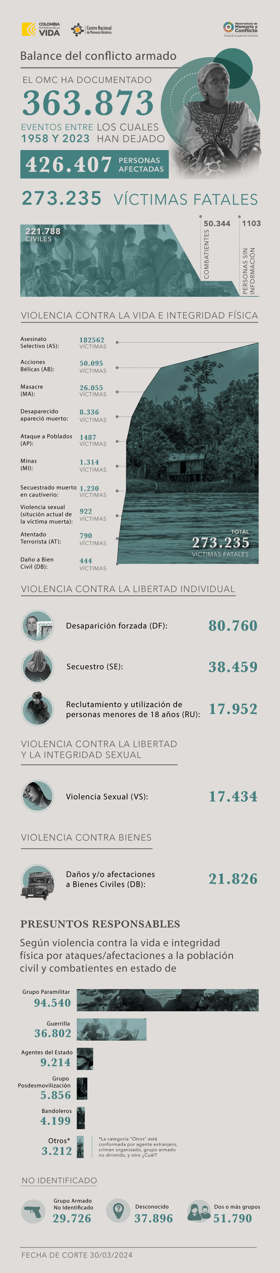Infografía del Observatorio de Memoria y Conflicto (OMC) del Centro Nacional de Memoria Histórica (CNMH) que presenta datos estadísticos y un balance general sobre los principales eventos del conflicto armado registrados en el país entre 1958 y 2024, con fecha de corte del 31 de marzo de 2024. Muestra el número total de eventos, el número de víctimas y desagrega datos por hechos relacionados con hechos de violencia contra la vida y la integridad física, contra la libertad individual, contra la libertad e integridad sexual y contra los bienes. Presenta también datos sobre los presuntos responsables.