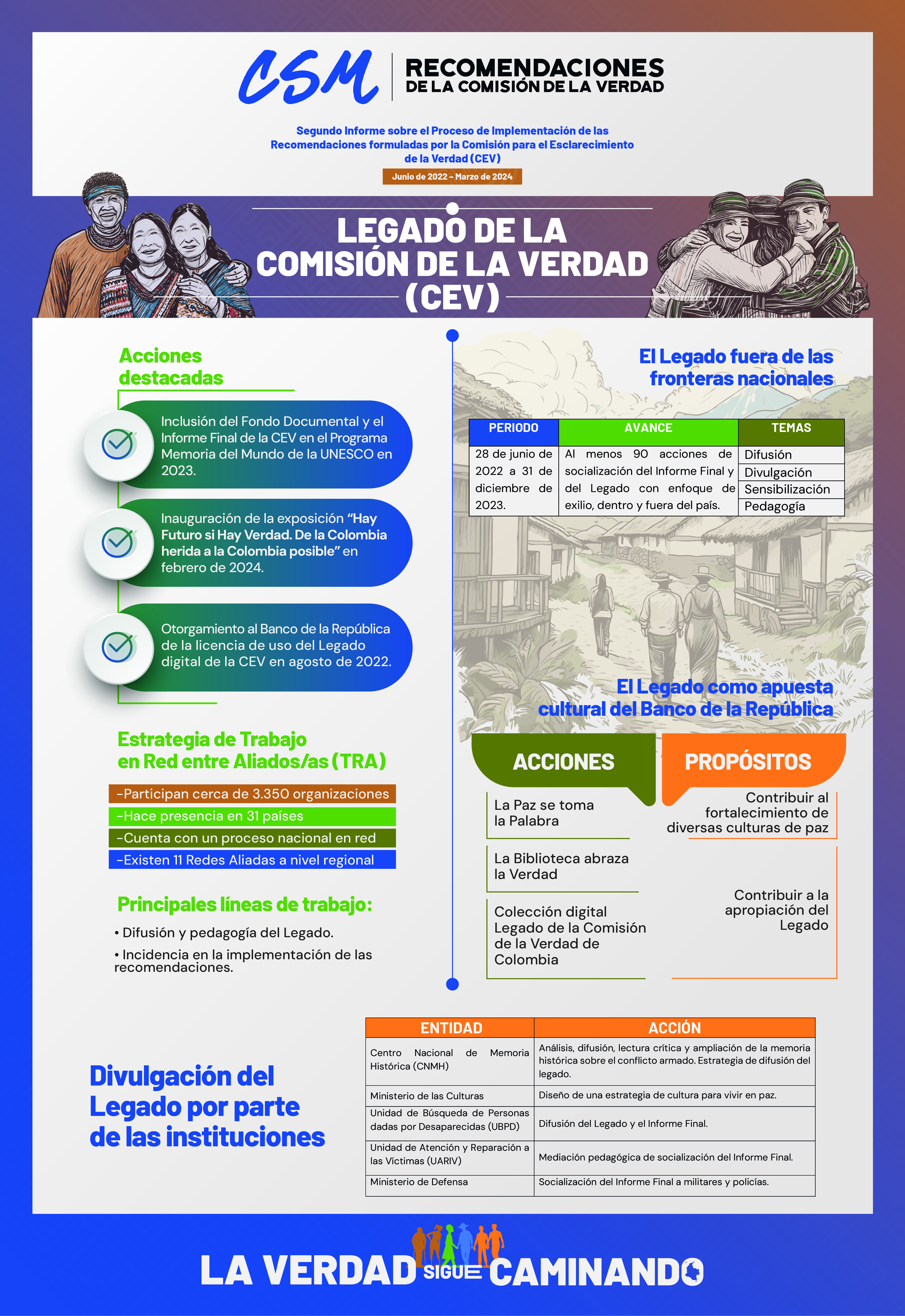 Infografía correspondiente al Segundo Informe sobre el avance, retroceso o estancamiento del proceso de implementación de las recomendaciones formuladas por la Comisión para el Esclarecimiento de la Verdad, la Convivencia y la No Repetición (CEV) del Comité de Seguimiento y Monitoreo a la Implementación de las Recomendaciones de la Comisión para el Esclarecimiento de la Verdad, la Convivencia y la No Repetición (CSM).