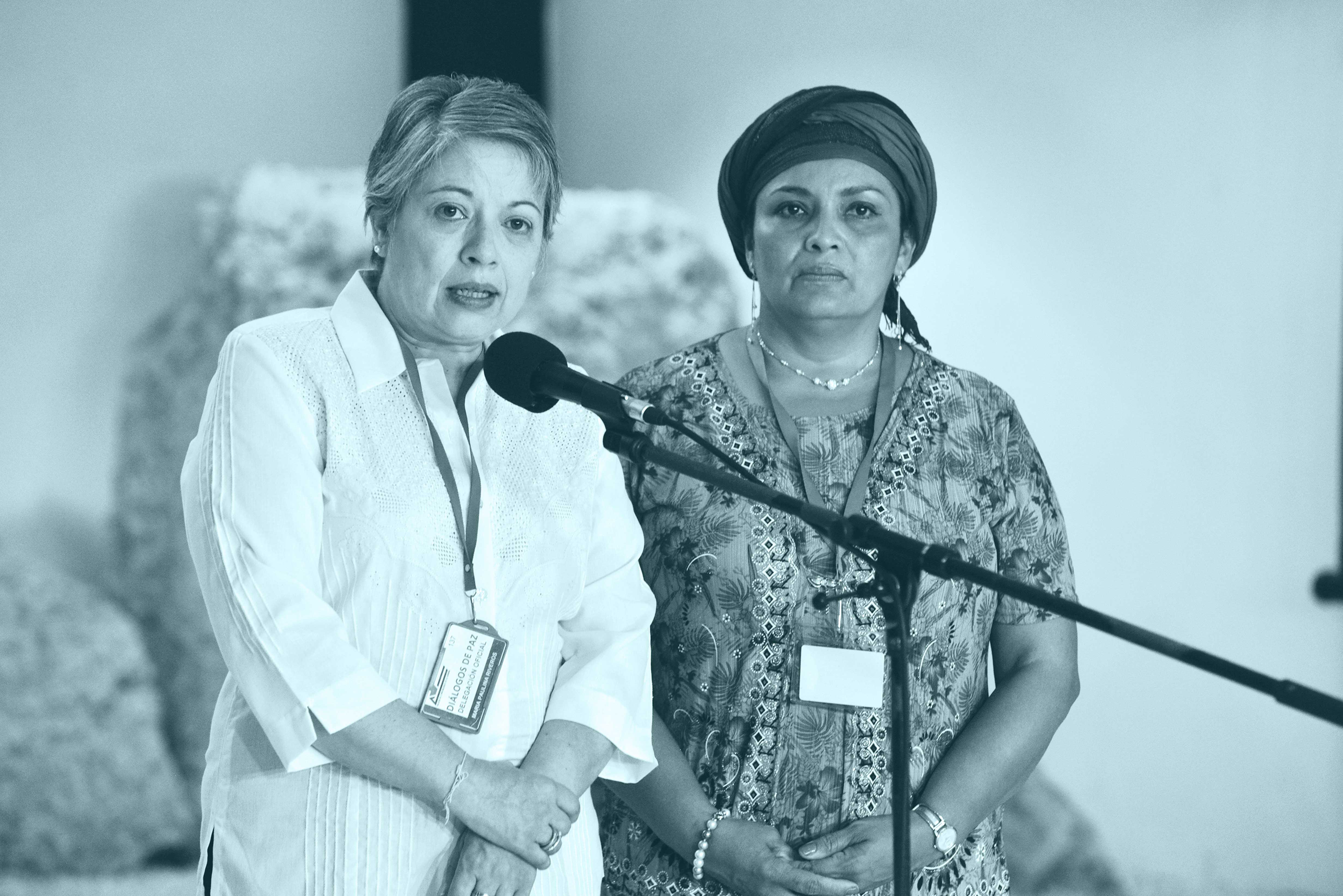María Paulina Riveros Dueñas, plenipotenciaria del Gobierno nacional, y Victoria Sandino Simanca Herrera (Victoria Sandino), de la Delegación de Paz de las FARC-EP, intervienen durante la visita de representantes de ONG para compartir experiencias de violencia sexual.