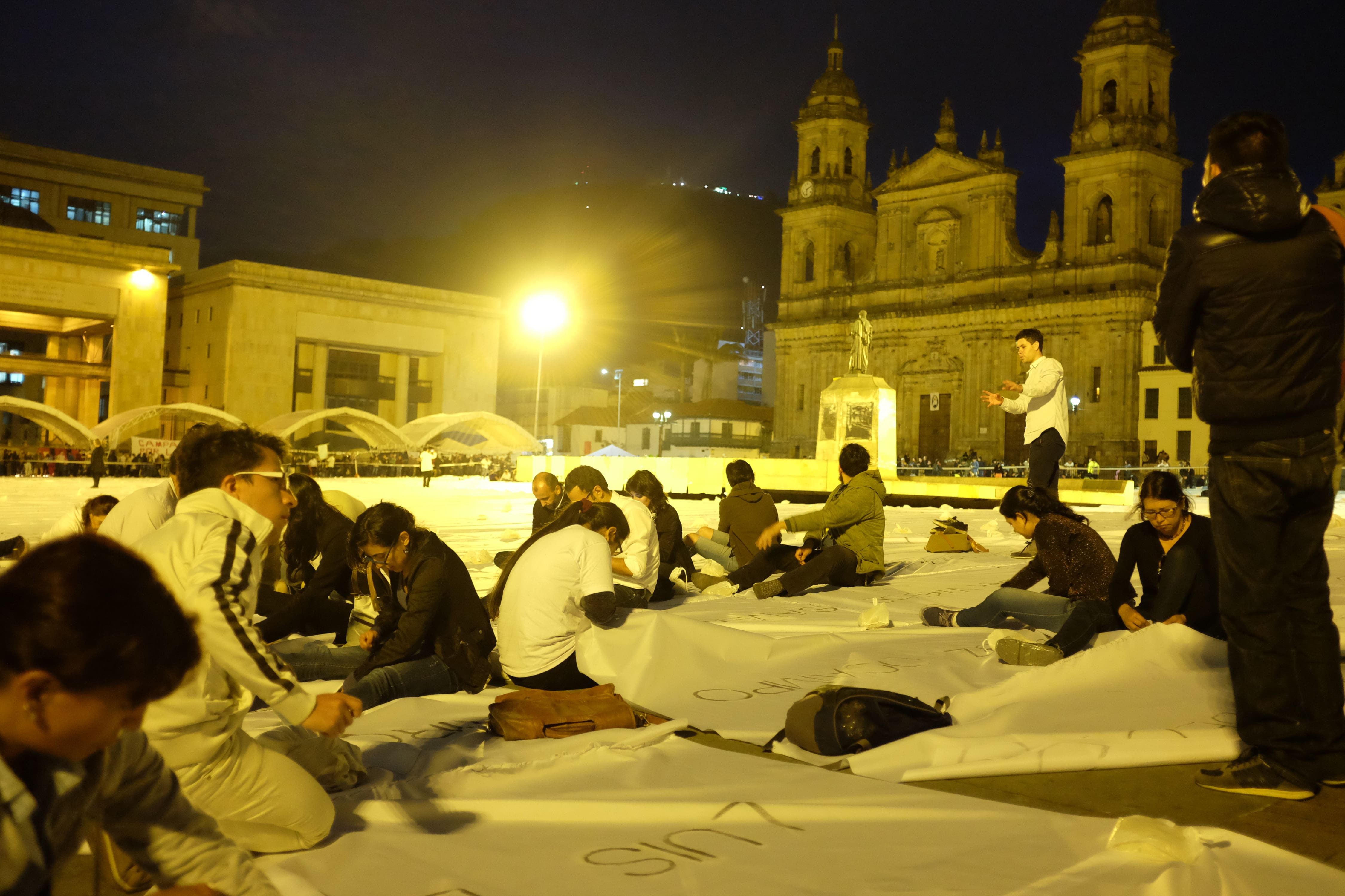 Convocados por la artista colombiana Doris Salcedo, miles de bogotanos de dieron cita en la Plaza de Bolívar para rendirle tributo a las víctimas a través de la obra “Sumando Ausencias”. Una inmensa bandera blanca con los nombres de más de 200 víctimas del conflicto colombiano que contribuyó a la construcción de la memoria en momentos en los que el país estaba en incertidumbre ante la pérdida del plebiscito por la Paz que buscada refrendar los Acuerdos de La Habana. Foto por Nelson Cárdenas.