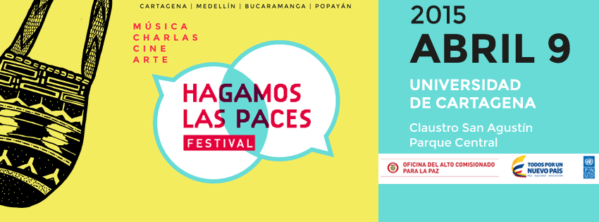 Poster de la campaña publicitaria del Festival hagamos las paces, evento promovido por la Oficina del Alto Comisionado para la Paz con el apoyo de las universidades y el Programa de las Naciones Unidas para el Desarrollo – PNUD. Este evento fue un aporte desde la academia al proceso de paz que se desarrollaba en La Habana, Cuba. Durante un día las universidades participantes vivieron experiencias de paz a través de actividades lúdicas y académicas. La música, el arte, documentales, música, charlas, proyecciones de películas, exposiciones fotográficas, presentación de obras de teatro y talleres, entre otras, fueron una forma de hacer pedagogía de paz y de acercar al sector educativo y a la sociedad en general al proceso de construcción de paz. En esta imagen, el poster del evento realizado el 9 de abril de 2015, con el apoyo de la Universidad Cartagena, en el Claustro San Agustín – Parque Central.