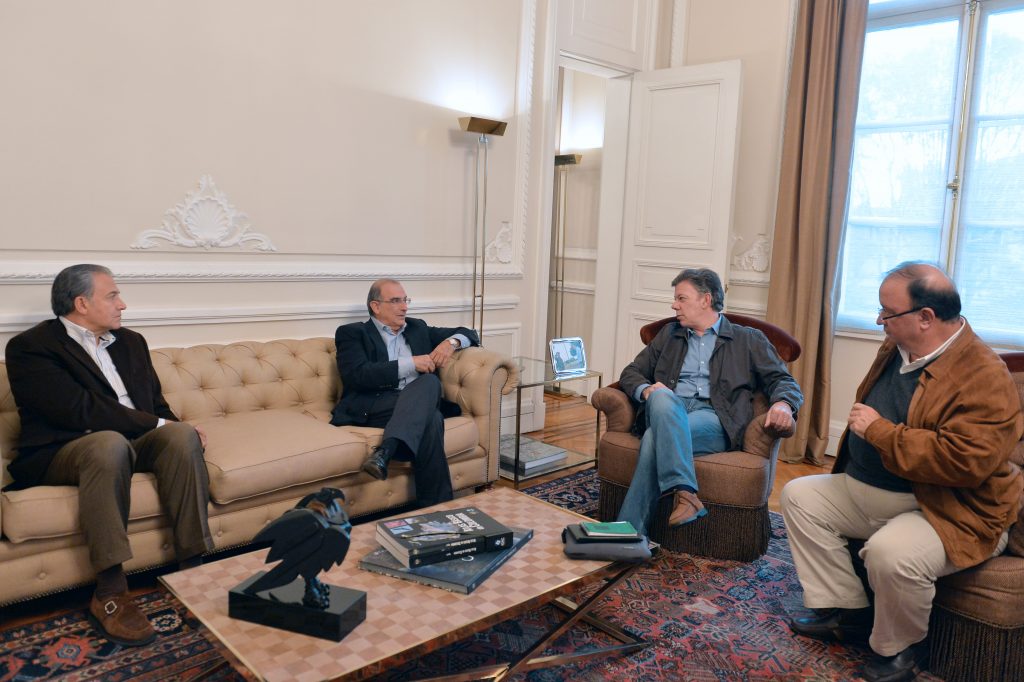 El presidente en sesión de trabajo con los integrantes de la Delegación del Gobierno nacional. En la imagen de izquierda a derecha: El general (r) Óscar Naranjo Trujillo, Humberto de la Calle Lombana, el presidente Juan Manuel Santos Calderón y Luis Carlos Villegas Echeverri. 25/08/2013 Bogotá Foto de Javier Casella – SIG / Presidencia de la República de Colombia.