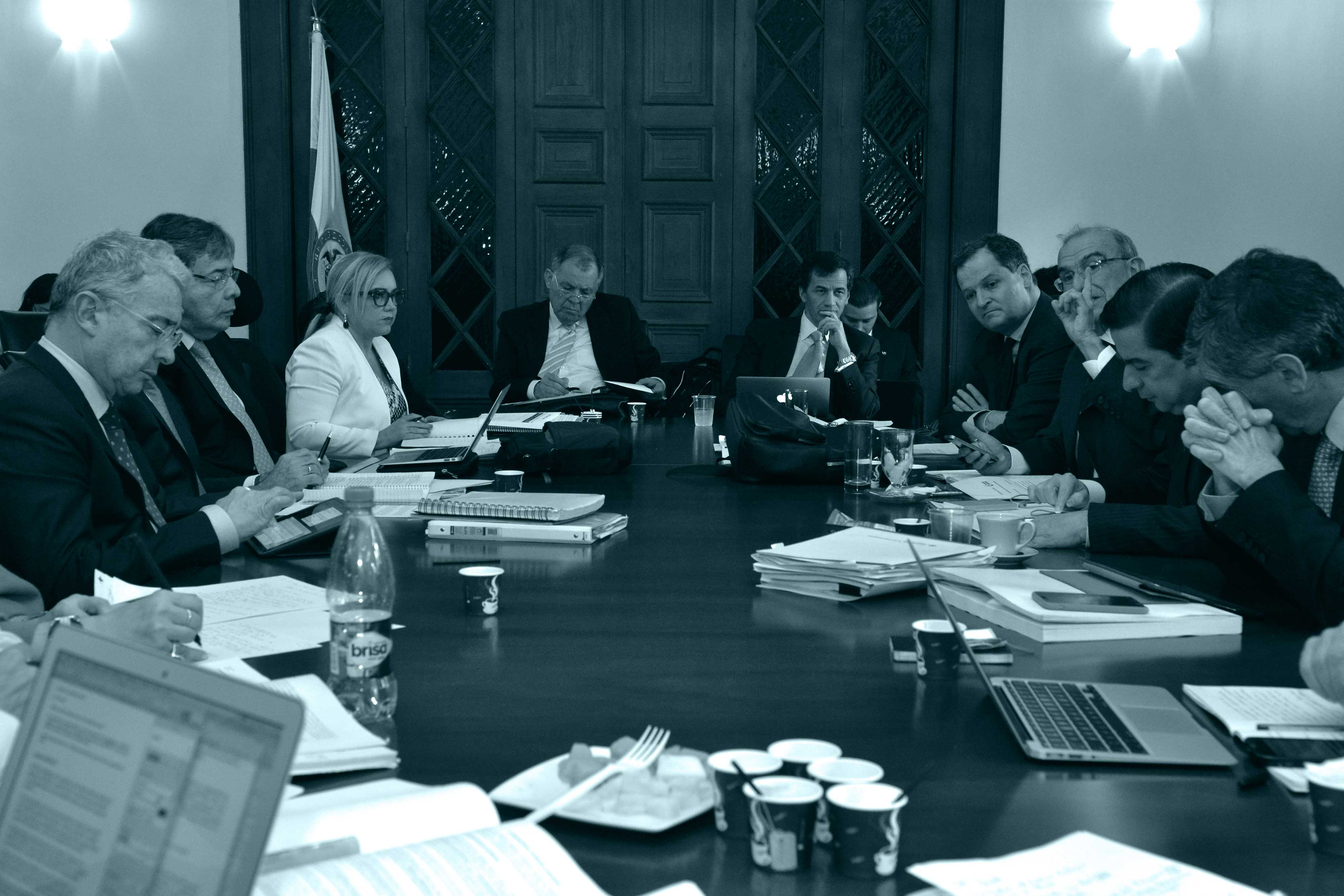 Reunión de Sergio Jaramillo Caro, alto comisionado para la Paz, Humberto de la Calle Lombana, jefe del Equipo Negociador del Gobierno, Juan Fernando Cristo Bustos, ministro del Interior, y Rafael Pardo Rueda, alto consejero para el Posconflicto, con los voceros de «No».