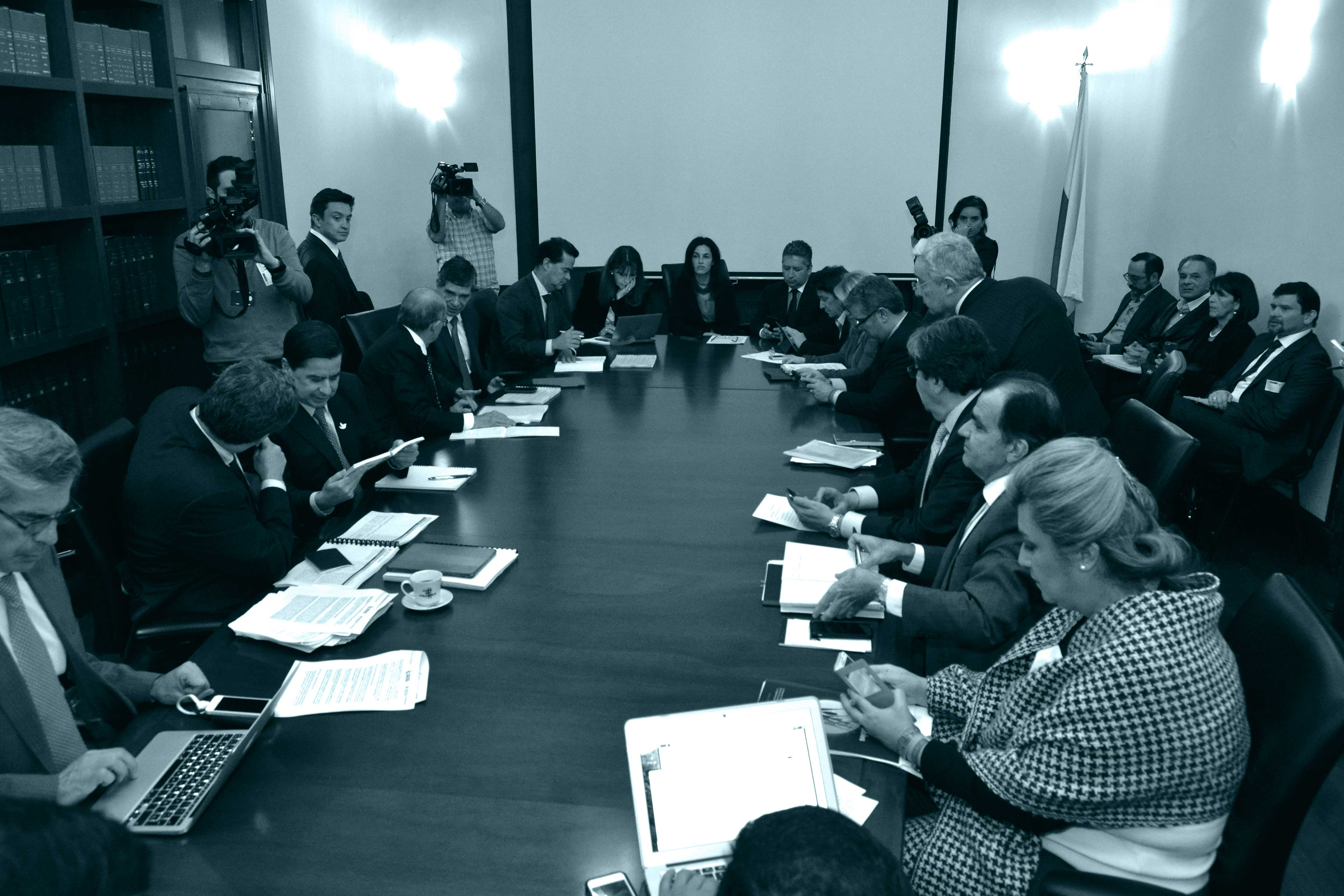 Reunión de Sergio Jaramillo Caro, alto comisionado para la Paz, Humberto de la Calle Lombana, jefe del Equipo Negociador del Gobierno, Juan Fernando Cristo Bustos, ministro del Interior, y Rafael Pardo Rueda, alto consejero para el Posconflicto, con los voceros de «No».