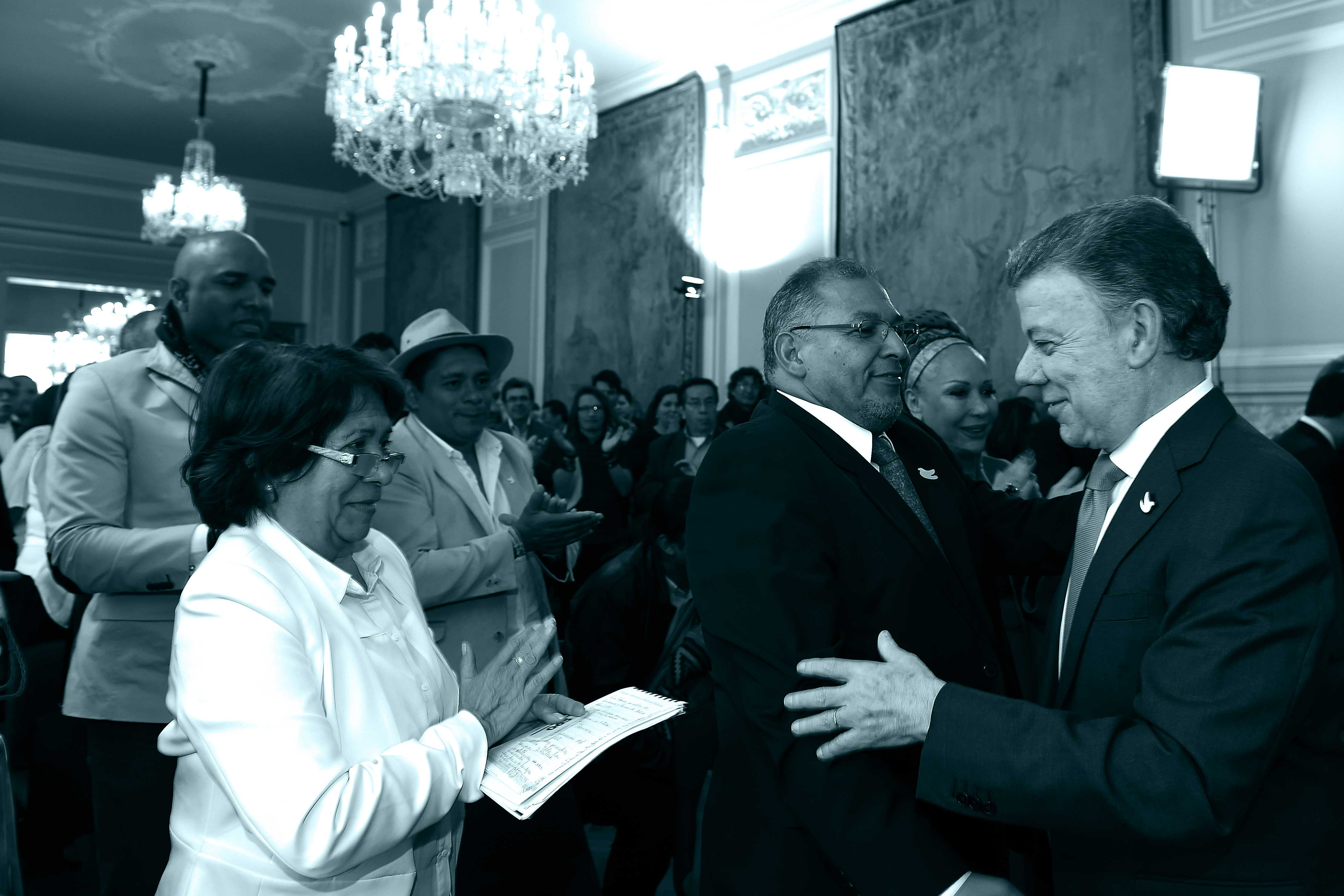 Reunión del presidente Juan Manuel Santos Calderón en la Casa de Nariño con distintos promotores del «Sí» en el plebiscito, quienes lo felicitan luego de serle otorgado el Premio Nobel de Paz.
